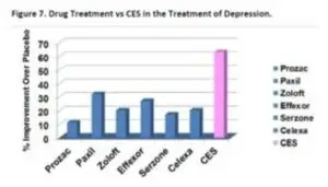 A meta- analysis study by Gilula & Kirsch (2005) of 290 depressives showed a direct comparison of CES against various depression medications. -Dave Siever, C.E.T. 2014